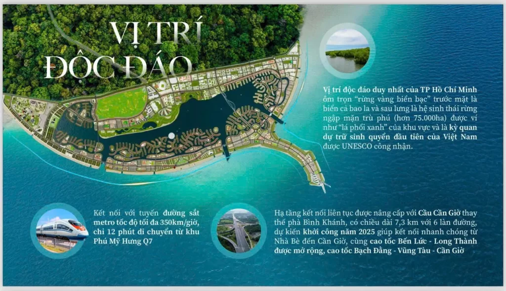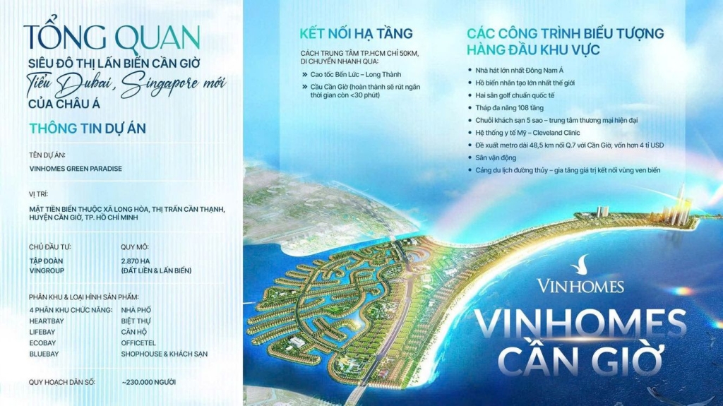 Vinhomes Green Paradise Cần Giờ do Tập đoàn Vingroup làm chủ đầu tư tọa lạc tại xã Long Hòa và thị trấn Cần Thạnh thuộc huyện Cần Giờ, TP HCM. Dự án có quy mô khoảng 2.870 ha, gồm 5 khu chức năng (vui chơi giải trí, du lịch nghỉ dưỡng, thương mại dịch vụ, nghỉ dưỡng cao cấp,…). Trong tương lai, Vinhomes Cần Giờ sẽ trở thành khu đô thị du lịch biển, du lịch nghỉ dưỡng, hội thảo, hội nghị kết hợp nghỉ dưỡng, đô thị thông minh, dịch vụ công nghệ cao, nhà ở, dịch vụ, khách sạn,… vô cùng tiềm năng hàng đầu thành phố Hồ Chí Minh.
